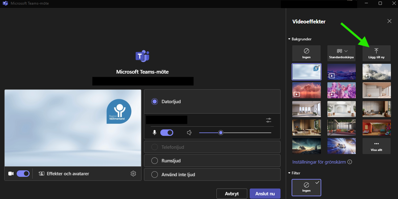 För att byta din bakgrundsbild går du till teams och väljer "lägg till ny".