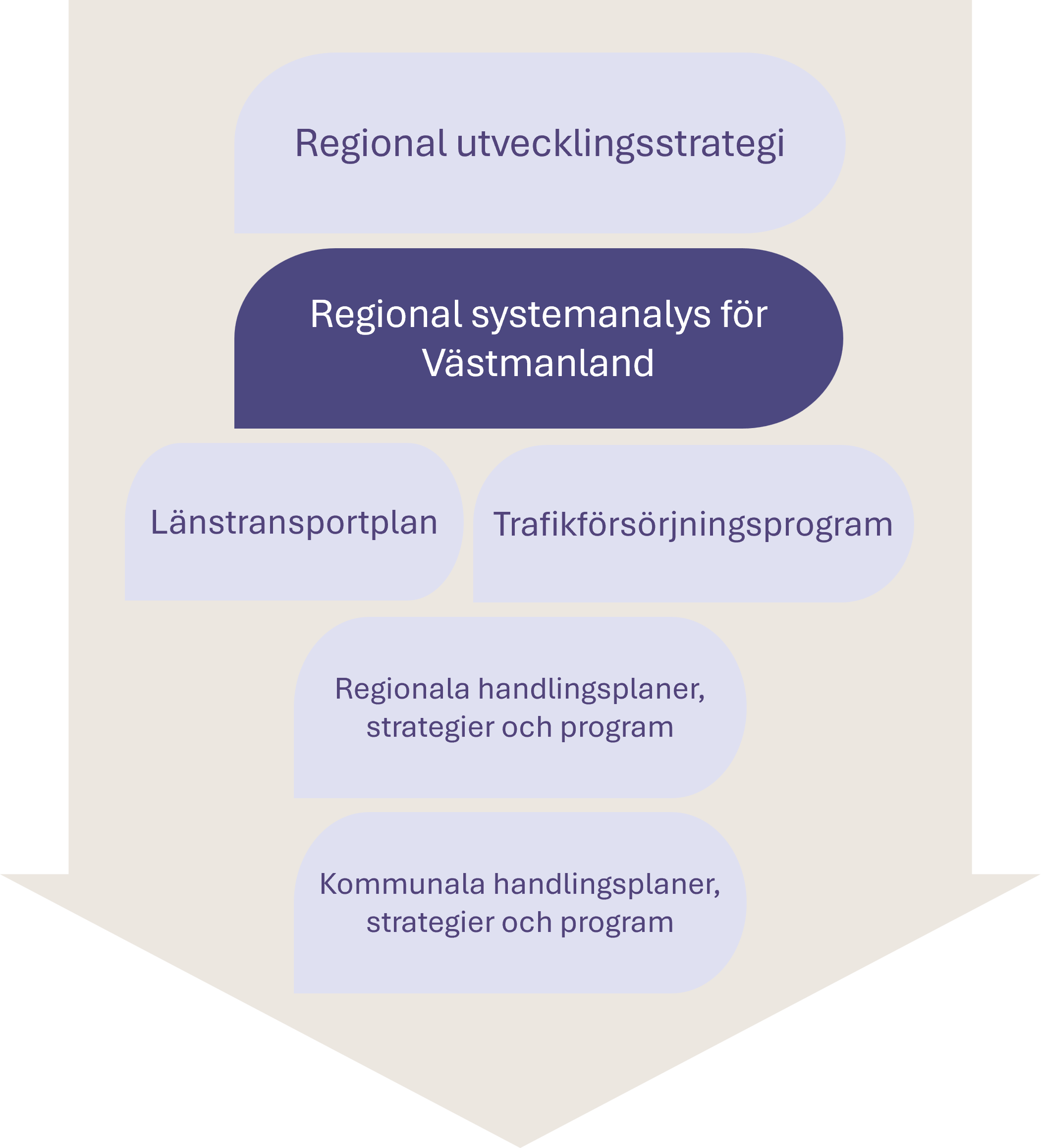 I framtagandet av Regional systemanalys för Västmanland har arbetet utgått från Handbok för trafikstrategiskt arbete som tagits fram av SKR (Sveriges Kommuner och Regioner), Trafikverket och Boverket samt ett fördjupningsdokument riktat till regioner. Det primära syftet med en regional trafikstrategi är att dokumentera en regionalt genomarbetad och politiskt förankrad utvecklingsstrategi för hållbar tillgänglighet med utgångspunkt i den regionala utvecklingsstrategin. Handboken innebär en process som bättre kopplar an till samhällsplaneringens olika områden och där fokus ligger på det bredare tillgänglighetsbegreppet snarare än enbart transportsystemets tillgänglighet genom mobilitet.